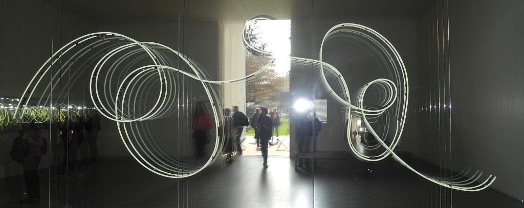 Schrill wirkt der Eingang zum Pavillon der Republik Korea. Mit buntem Neonlicht täuscht die Installation „Venetian Rhapsody“ des Konzeptkünstlers Cody Choi (geb. 1961) ein Spielcasino vor. Innen beschäftigt sich „Counterbalance. The Stone and the Mountain“ mit der Frage, wie Einzelschicksale zur nationalen Historie beitragen. Darin eingebettet ist die Installation „Eigenzeit“ von Lee Wan (geb. 1984) mit 668 personalisierten Uhren, die mit unterschiedlicher Geschwindigkeit laufen, abhängig davon, wieviel Zeit die Personen, von denen ich Alter, Beruf und Lebensland erfahre, arbeiten müssen, um eine Mahlzeit zu verdienen.