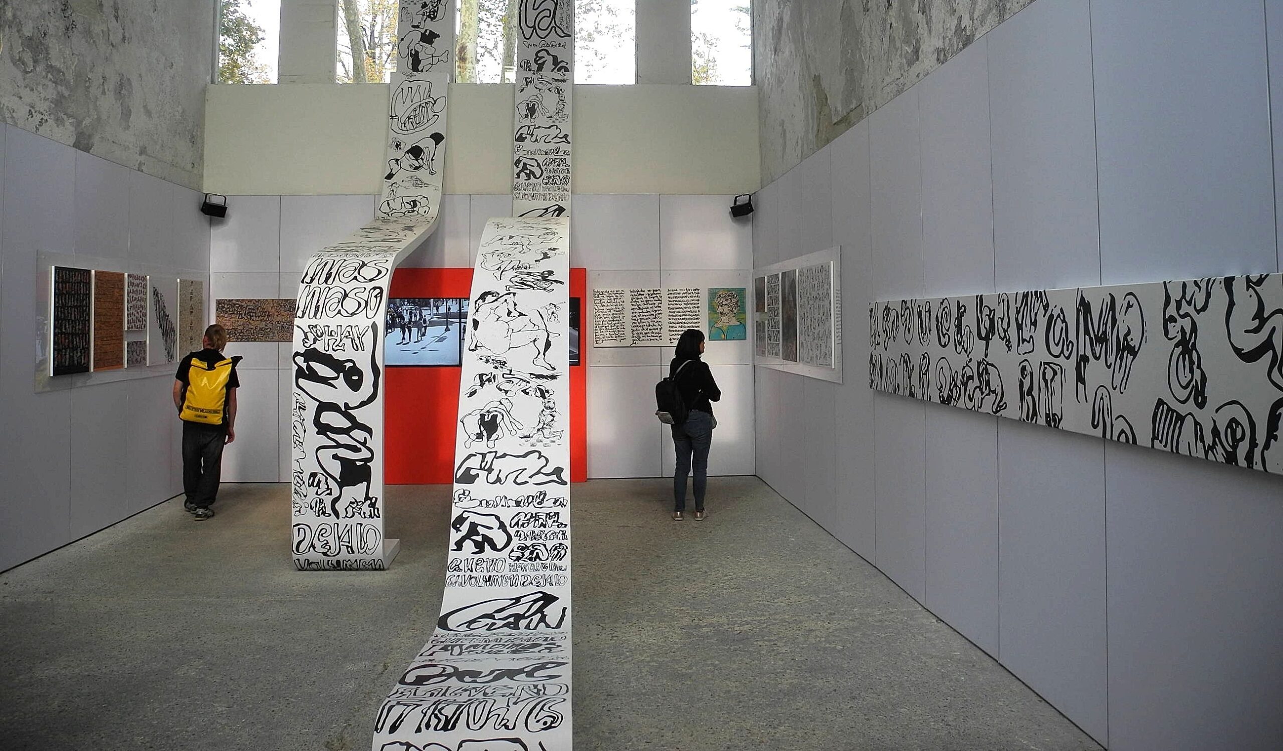 In der Geografie der Biennale liegt Venezuela zwischen der Schweiz und Russland. Die Bolivarische Republik beteiligt sich mit „Formas Escapándose del Marco“ von Juan Calzadilla (geb. 1930). Objekte verlassen den ihnen zugedachten Platz. Kalligraphische Strukturen bedecken Leinwandbänder, die sich von Wänden lösen und in den Raum eindringen, so wie Worte und Sätze ins Hirn, so wie Kreativität in die Gesellschaft, damit sie ein soziales Wesen wird.